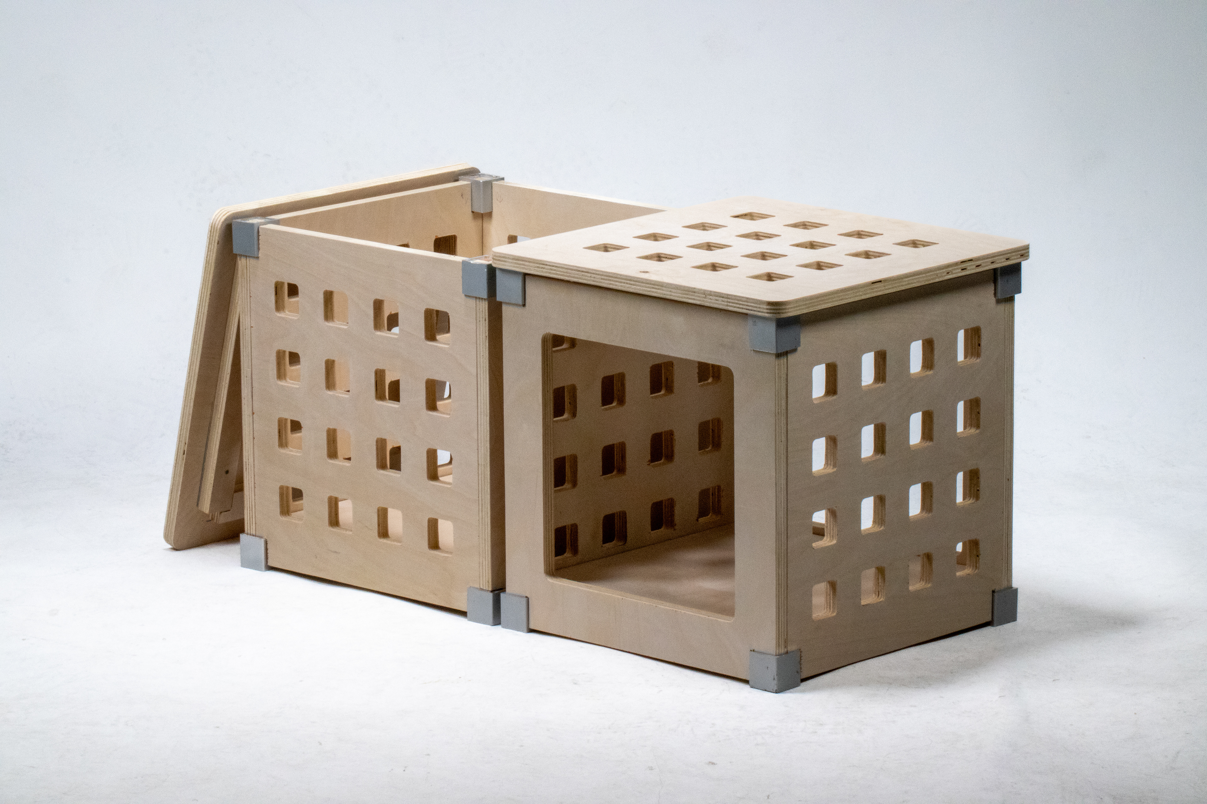 The furniture is manufactured by one single plywood sheet and can be packaged flat. The aluminum joints are simply cut from square tubes.